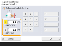 Trykk på <X> eller <Y> for å angi lengden på hver side med talltastene. ![]() Hvis du registrerer papirstørrelsen som du bruker ofte med knappene <S1> til <S4>, kan du hente dem frem med ett trykk. Registrere papir i fritt format (egendefinert papirstørrelse) | |