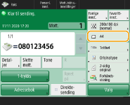 Kontrollere totalt antall angitte mottakereDet totale antallet angitte mottakere vises øverst på skjermbildet. Dette lar deg bekrefte at antallet mottakere er korrekt før du sender. ![]() Sende med senderinformasjonenDu kan sende med senderens navn og faksnummer. <Avsender ID> Sjekke statusen for sendte dokumenterPå <Statusoverv.>-skjermbildet kan du sjekke statusene for sendte dokumenter. Dette skjermbildet lar deg sende fakser på nytt eller avbryte sendingen etter at du har sjekket statusene. Kontrollere status og logg for sendte og mottatte dokumenter Når <Vis varsel når jobb godtas> er innstilt til <On>, kan <Statusoverv.>-skjermbildet vises fra følgende skjermbilde som vises etter at en sendt jobb er mottatt. <Vis varsel når jobb godtas> ![]() Når det oppstår en overføringsfeil fordi mottakerens linje er opptattMaskinen ringer på nytt automatisk etter en viss tid. Du kan endre innstillinger som hvor mange ganger maskinen ringer på nytt, og intervallet mellom repetisjonene. <Auto repetisjon> Skrive ut rapporten for senderesultateneNår du trykker på <Valg> <Senderesultatrapport> på skjermbildet Grunnleggende funksjoner for faks, kan du stille inn automatisk utskrift av rapporten som lister resultatene av sendingen.For å angi dette for hver jobb fra <Valg> er det nødvendig å velge <Kun for feil> eller <Av> i <Senderesultatrapport> og deretter angi <Tillat utskrift fra Alternativer> til <På>. Når fotoene i det sendte bildet er for mørke eller for lyse, kan ikke farger i bakgrunnen på fargeoriginaler fjernesKvaliteten på det sendte bildet kan kanskje forbedres dersom de følgende betingelsene/innstillingene er oppfylt. Jobbtype: Faks (Sende minne) eller Skann og send (Faks/I-faks) <Velg farge>: <Svart-hvitt> (Skann og send) <Originaltype>: <Tekst> <Tetthet> <Bakgrunnstetthet>: <Auto><Oppløsning>: 200 dpi x 400 dpi, 300 dpi x 300 dpi*, 400 dpi x 400 dpi, eller 600 dpi x 600 dpi* *Kan stilles inn for Skanne og sende <Hastighet/bildekvalitetprioritet for svart-hvitt-skanning> Faks/I-faks sendejobber: <Kvalitetprioritet> (<Hastighet/bildekvalitetprioritet for svart-hvitt-skanning>) |