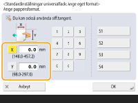 Tryck på <X> eller <Y> för att ange längden på varje sida med sifferknapparna. ![]() Om du registrerar pappersformat du använder ofta på knapparna <S1> till <S4> kan du hämta dem med ett knapptryck. Registrera papper i fritt format (Eget format) | |