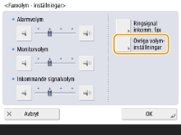 <Alarmvolym>Justera volymen för ljudsignaler som avges när sändningen avbryts eller när utskriften av ett mottaget fax är klar. Om du inte vill att ljudsignaler ska avges, trycker du på