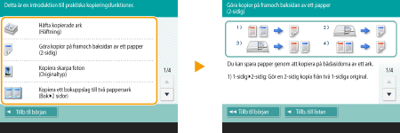Visa funktionsguidenTryck på <Vägledning> för att visa en skärmbild som ger en introduktion till vad du kan göra med funktionerna i maskinen samt tips för att kopiera, scanna etc. Visa den här skärmbilden när du vill lära dig mer om vilka funktioner som finns och hur du kan använda dem. ![]() Exempel: Vägledning för kopieringsfunktioner När du väljer ett alternativ i listan visas handledningsskärmbilden. ![]() Använda hjälpfunktionenBeroende på vilken funktion som visas, visas ibland uppe till höger på skärmen. Tryck på för att kontrollera beskrivning och funktionsmetod för funktionen.![]() Tryck på <Slut> för att återgå till föregående skärm. Fungerar på samma sätt som med en smartphone (nyp/dra och släpp)På vissa skärmbilder kan du växla sida eller scrolla genom att dra fingret upp/ned eller åt vänster/höger på skärmbilden på samma sätt som med en smartphone. ![]() ![]() Du kan också inaktivera nypfunktionerna. <Använd funktion för att Svepa> Nypfunktioner samt dra- och släppåtgärder kan inte användas när <Invertera skärmfärger> är inställt som <På>. <Invertera skärmfärger> På en skärm med flyttbara knappar kan knapparna dras och släppas. ![]() |