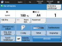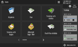 Tryck på som visas på <Hem>-skärmen och skärmen med grundläggande funktioner för att anpassa skärmen genom att t.ex. flytta på knappar eller skapa en snabbtangent. Anpassa pekskärmen![]() Du kan ändra inställningarna för skärmbildsvisningen, som t.ex. vilken skärmbild som visas när du slår på maskinen och om meddelandet för återstående papper och toner ska visas. <Visningsinställningar> Du kan ställa in vilken skärmbild som ska visas när en viss tid har passerat utan åtgärd. <Funktion efter autoåterställning> |