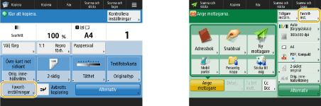 Om du ofta använder samma kombination av inställningar för kopiering, fax och scanning är det praktiskt om du har dessa inställningar registrerade som <Favoritinst.>.