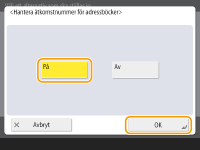 ![]() | Du kan förhindra läckage av känslig eller personlig information från adressboken genom att ställa in en PIN-kod eller hindra vissa mottagare från att visas i adressboken. Du kan även dölja själva adressboken. Administratörsbehörighet krävs för att konfigurera dessa inställningar. |