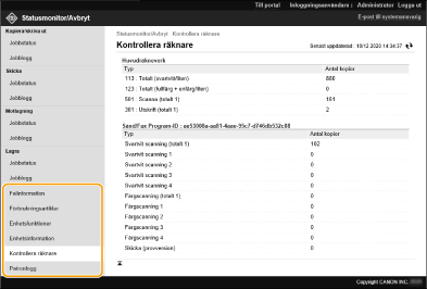 Du kan kontrollera olika slags information om maskinen, som t.ex. felinformation, mängden återstående papper och toner, information om monterade tillval och det totala antalet sidor som hittills skrivits ut.