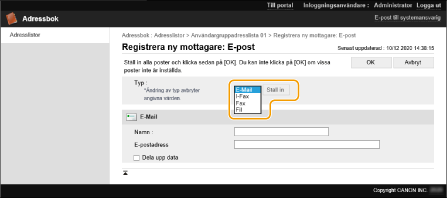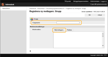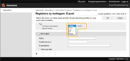 [Inställningar för Personlig adresslista/adresslista användargrupp] och markera kryssrutan [Använd Namnändring användargrupp till Användargruppsadresslistenamn.]. [Använd Namnändring användargrupp till Användargruppsadresslistenamn.] är bara tillgängligt när personlig autentisering är aktiverad.