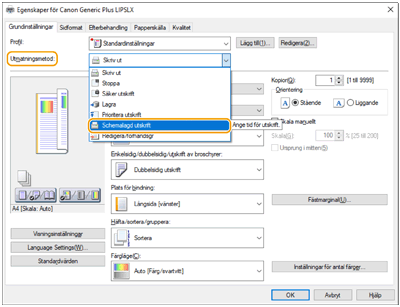 ![]() | Du kan ange en tidpunkt när utskriften ska börja, vilket är praktiskt när du t.ex. skriver ut många dokument på natten. |