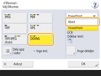 1 | Välj <OOXML> välj <Word> i listrutan.![]() ![]() Om du vill ändra ett språk för OCR trycker du på <Ange detaljer> <Ändra> välj ett språk eller en språkgrupp tryck på <OK>. |
