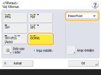 1 | Välj <OOXML> välj <PowerPoint> i listrutan.![]() ![]() För att ändra språk som används för OCR trycker du på <Ange detaljer> <Ändra> välj språket tryck på <OK>. |