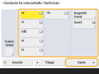 Tryk på <X> eller <Y> for at indtaste længden på hver side med taltasterne. ![]() Hvis du registrerer papirformatet, du anvender, på knapperne <S1> til <S4>, kan du hente dem med en enkelt tryk. Registrering af papir med frit format (Papir med brugerdefineret format) | |