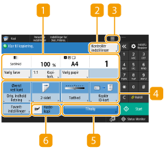 Viser indstillingsstatus, som f.eks. kopiforholdet, papirformatet og kopiantallet. Sørg for at tjekke indstillingerne for at kopiere korrekt. For at ændre indstillingerne skal du trykke på knappen under displayafsnittet.