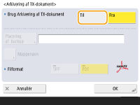 Du kan ikke udføres en direkte afsendelse, hvis du indstiller <Arkivering af TX-dokument> til <On>. Denne indstilling skifter automatisk til <Fra> i følgende tilfælde. Angiv modtageren igen, eller sæt indstillingen tilbage til <Til>, alt efter hvad der er brug for. Når backupmodtageren er slettet fra adressebogen Når en adressebog er blevet importeret fra Remote UI Import/eksport af indstillingsdataene Når en adressebog er blevet modtaget fra software til styring af adressebog. <Import/Eksport fra Address Book Management-softw.> |