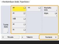 Valitse kummankin sivun pituus numeropainikkeilla valitsemalla <X> tai <Y>. ![]() Kun tallennat usein käyttämäsi paperikoot painikkeille <S1>–<S4>, voit käyttää niitä yhdellä painalluksella. Vapaan paperikoon (Muokattu paperikoko) tallentaminen | |