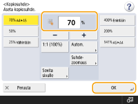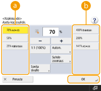 | | Voit suurentaa tai pienentää määrittämällä kopiosuhteen (%). Voit määrittää pysty- ja vaakasuhteet erikseen. Kopioiden suurentaminen tai pienentäminen määrittämällä kopiosuhde |
