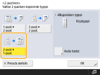 Määritä asiakirjan suunta valitsemalla <Aseta tiedot>. Valitse <Kirjatyyppi>, jos haluat, että asiakirjan etu- ja taustapuolen ylä- ja alareunat ovat samansuuntaisesti. Valitse <Kalenterityyppi>, jos haluat, että asiakirjan etu- ja taustapuolen ylä- ja alareunat ovat vastakkaisiin suuntiin.