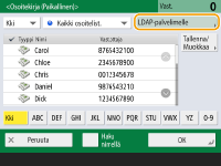 Kohtia <Tallenna uusi vastaanottaja>, <Tiedot/Muokkaa> ja <Poista> kohdassa <Tallenna/Muokkaa> näytössä <Osoitekirja (Paikallinen)> voidaan käyttää uusien vastaanottajien tallentamiseen, tietojen tarkistamiseen ja vastaanottajien muokkaamiseen tai poistamiseen. Voidaksesi käyttää Etäosoitekirjaa, sinun on koostettava palvelinlaitteen asetukset. Aseta Etäosoitekirja avautumaan ulkoisesti palvelinlaitteessa. |