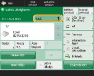 Määritettyjen vastaanottajien määrän tarkistaminenMääritettyjen vastaanottajien määrä näkyy näytön oikeassa yläkulmassa. Näin voit varmistaa ennen lähettämistä, että vastaanottajien määrä on oikea. ![]() Lähetys lähettäjän tiedoillaVoit lahettää lähettäjän nimellä ja faksinumerolla. <Lähettäjän tiedot> Lähetettyjen asiakirjojen tilan tarkistaminen<Tilavalvonta>-näytössä voit tarkistaa lähetettyjen asiakirjojen tilan. Tässä ikkunassa voit lähettää faksit uudelleen tai peruuttaa lähetyksen tarkistuksen jälkeen. Lähetettyjen ja vastaanotettujen asiakirjojen tilan ja lokin tarkistaminen Kun <Näytä ilmoitus kun työ on hyväksytty> -asetuksena on <On>, <Tilavalvonta>-näyttö voidaan avata seuraavalla näytöllä, joka tulee esiin, kun lähetystyö vastaanotetaan. <Näytä ilmoitus kun työ on hyväksytty> ![]() Kun lähetysvirhe tapahtuu siksi että vastaanottajan linjaon varattuLaite valitsee numeron uudelleen määrätyn ajan kuluttua. Voit vaihtaa asetuksia kuten montako kertaa laite valitsee numeron uudelleen ja uudelleenvalintojen välin. <Autom. uudelleenvalinta> Raportin tulostaminen lähetysten tuloksistaKun valitset faksin perustoimintonäytössä <Lisäasetukset> <Lähetystulos -raportti>, voit tulostaa automaattisesti raportin, jossa kerrotaan lähetystulokset.Kun haluat asettaa tämän kullekin työlle kohdassa <Lisäasetukset>, sinun on valittava <Vain virhetilassa> tai <Ei> kohdassa <Lähetystulos -raportti> ja määritettävä <Salli tulostus lisäasetuksista> -asetukseksi <Kyllä>. Kun lähetyssä kuvassa olevat valokuvat ovat liian tummia tai vaaleita, värillisten alkuperäisten taustavärejä ei voi poistaaLähetetyn kuvan laatua voidaan ehkä parantaa, jos seuraavat ehdot/asetukset täytetään. Työn tyyppi: Faksi (muistilähetys) tai Skannaa ja lähetä (faksi/I-faksi) <Valitse väri>: <Mustav.> (Skannaa ja lähetä) <Alkuperäisen tyyppi>: <Teksti> <Tummuus> <Taustan tummuus>: <Aut.><Tarkkuus>: 200 dpi x 400 dpi, 300 dpi x 300 dpi*, 400 dpi x 400 dpi, tai 600 dpi x 600 dpi* *Voidaan määrittää toiminnolle Skannaa ja lähetä <Nopeus/laatu etusijalla mustavalkoskannauksessa> Faksin/I-faksin lähetystyöt: <Laatu etusijalla> (<Nopeus/laatu etusijalla mustavalkoskannauksessa>) |