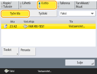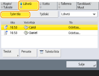 Valitsemalla <Tiedot> <Lähetä uudelleen> voit lähettää uudelleen asiakirjat, joiden lähetys epäonnistui. Voit määrittää toisen vastaanottajan valitsemalla <Muuta vastaanottaja>. Voit lähettää asiakirjoja useille vastaanottajille samalla lähetystavalla valitsemalla <Lähetyslista>, valitsemalla vastaanottajan ja valitsemalla sitten <Lähetä uudelleen> tai <Muuta vastaanottaja>.Voit lähettää asiakirjat uudelleen, kun <Poista virheellinen lähetys> -asetuksena on <Ei> (<Poista virheellinen lähetys>). Huomioi, että et voi lähettää uudelleen asiakirjoja, jotka lähetettiin suoralähetyksellä, manuaalisella lähetyksellä tai faksattiin tietokoneesta. Voit vaihtaa sellaisten asiakirjojen vastaanottajia jotka on asetettu lähetettäväksi määrättynä aikana tai joiden lähetys epäonnistui. Huomioi, että et voi vaihtaa sellaisten lähetettävien asiakirjojen vastaanottajia, joille on määritetty useita vastaanottajia, tai jos uuden vastaanottajan syöttäminen on estetty (Käytettävissä olevien vastaanottajien rajoittaminen). Vastaanottajan voi muuttaa lähetyshäiriön vuoksi peruutetulle työlle tai ajastetulla lähetyksellä lähettämistä odottavalle työlle. Useita vastaanottajia ei voi valita samanaikaisesti. Et myöskään voi muuttaa kaikkia ryhmän vastaanottajia samanaikaisesti. |