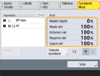 Voit tarkistaa jäljellä olevien tarvikkeiden määrän Remote UI (Etäkäyttöliittymä) -sovelluksesta. Laitteen tilan tarkistaminen |