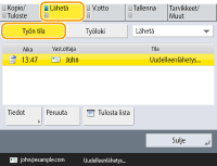 Valitsemalla <Tiedot> <Lähetä uudelleen> voit lähettää tai tallentaa uudelleen asiakirjat, joiden lähetys tai tallennus epäonnistui. Voit määrittää toisen vastaanottajan valitsemalla <Muuta vastaanottaja>. Voit lähettää asiakirjoja useille vastaanottajille samalla lähetys- tai tallennustavalla valitsemalla <Lähetyslista>, valitsemalla vastaanottajan ja valitsemalla sitten <Lähetä uudelleen> tai <Muuta vastaanottaja>.Voit lähettää tai tallentaa asiakirjat uudelleen, kun <Poista virheellinen lähetys> -asetuksena on <Ei>. <Poista virheellinen lähetys> Voit vaihtaa sellaisten asiakirjojen vastaanottajia jotka on asetettu lähetettäväksi/tallennettavaksi määrättynä aikana tai joiden lähetys/tallennus epäonnistui. Huomioi, että et voi vaihtaa sellaisten lähetettävien tai tallennettavien asiakirjojen vastaanottajia, joille on määritetty useita vastaanottajia, tai jos uuden vastaanottajan syöttäminen on estetty (Uusien vastaanottajien estäminen). |