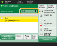 Määritettyjen vastaanottajien määrän tarkistaminenMääritettyjen vastaanottajien määrä näkyy näytön oikeassa yläkulmassa. Näin voit varmistaa ennen lähettämistä, että vastaanottajien määrä on oikea. Jos haluat peruuttaa lähetettävän työn hetiJos painat käyttöpaneelissa  (Pysäytys), kun työtä lähetetään, esiin tulee ilmoitus <Peruutetaanko seuraava lähetystyö?>. Peruuta lähetys valitsemalla <Kyllä>. Kun painat  (Pysäytys) ja lähetystöitä on useita, esiin tulee näyttö peruutettavan työn valitsemista varten. Jos lähetystyötä, jonka haluat peruuttaa, ei näy näytössä, valitse <Tarkasta muut työt>, joka näyttää kohdan <Lähetä työt>. Valitse työ, jonka haluat peruuttaa ja paina <Peruuta>. Lähetettyjen asiakirjojen tilan tarkistaminen<Tilavalvonta>-näytössä voit tarkistaa lähetettyjen ja tallennettujen asiakirjojen tilan. Tässä ikkunassa voit lähettää/tallentaa asiakirjat uudelleen tai peruuttaa lähetyksen/tallennuksen tilan tarkistuksen jälkeen. Skannattujen asiakirjojen tilan ja lokin tarkistaminenKun <Näytä ilmoitus kun työ on hyväksytty> -asetuksena on <Kyllä>, <Tilavalvonta>-näyttö voidaan avata seuraavalla näytöllä, joka tulee esiin, kun lähetystyö vastaanotetaan. <Näytä ilmoitus kun työ on hyväksytty>Raportin tulostaminen lähetysten/tallennuksen tuloksistaKun valitset skannauksen perustoimintonäytössä <Lisäasetukset>  <Lähetystulos -raportti>, voit tulostaa automaattisesti raportin, jossa kerrotaan lähetyksen ja tallennuksen tulokset. Kun haluat asettaa tämän kullekin työlle kohdassa <Lisäasetukset>, sinun on valittava <Vain virhetilassa> tai <Ei> kohdassa <Lähetystulos -raportti> ja määritettävä <Salli tulostus lisäasetuksista> -asetukseksi <Kyllä>. Tiedoston nimiKun tiedosto lähetetään/tallennetaan, sen tiedostonimi asetetaan automaattisesti seuraavan muodon mukaisesti. Voit muuttaa asetusta siten että erilainen nimi voidaan antaa. Tiedoston nimeäminenLähetys sähköpostitse "Työnumerot (neljä numeroa)_sivunumerot (kolme numeroa).tiedostopääte", kuten "1042_001.jpg" Tallennus tiedostopalvelimeen "Tiedoston tallennuksen vuosi, kuukausi, päivä, tunti, minuutti ja sekunti (14 numeroa).tiedostopääte", kuten "20151030133541.jpg" S-postin aihe |