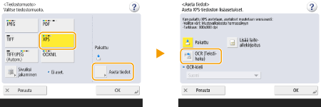 ![]() | Tällä toiminnolla voit suorittaa OCR:n (optical character recognition) irrottaaksesi skannatusta kuvasta datan, joka voidaan tunnistaa tekstiksi skannatusta kuvasta ja luoda haettavan PDF/XPS/OOXML (pptx/docx) -tiedoston. Voit myös valita <Pakattu>, jos valitset PDF- tai XPS-tiedostomuodon. |