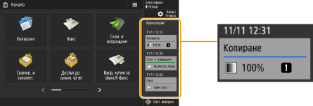Хронологията е удобна за потребители, които често използват едни и същи настройки и дестинации за функциите като „Копиране“ и „Сканиране и изпращане“. Използваните настройки се добавят автоматично към хронологията и могат да бъдат натиснати за извикване на същите настройки.