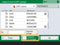 <Регист. на нова дестин.>, <Детайли/Редактиране> и <Изтр-не> в <Рег./Редакт.> на екрана <Адресна книга (Локално)> може да се използва за регистриране на нови дестинации, проверка на детайли и редактиране/изтриване на дестинации. За да използвате отдалечената адресна книга, е необходимо да конфигурирате настройките на сървърната машина. Задайте външно отваряне на отдалечената адресна книга на сървърната машина. |