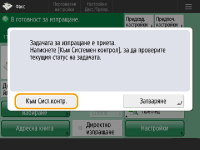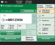За проверка на общия брой на зададените дестинацииОбщият брой посочени дестинации се показва в горната част на екрана. Това ви позволява преди изпращане да потвърдите, че броят на дестинациите е правилен. ![]() За изпращане с информация за изпращачаМожете да изпращате с името и факс номера на изпращача. <Идентификация на изпращащия терминал> За проверка на състоянието на изпратени документиНа екрана <Сист. контрол> можете да проверявате състоянието на изпратените документи. Този екран ви позволява да изпращате факсове повторно или да отказвате изпращане след проверка на състоянията. Проверка на състоянието и регистъра на изпратените и получените документи Когато <Извежд. съобщение, когато задачата е приета> е зададено на <On>, екранът <Сист. контрол> може да се изведе от следващия екран, който се показва след получаване на задача за изпращане. <Извежд. съобщение, когато задачата е приета> ![]() Когато се появи грешка при предаване заради заета линия на получателяМашината автоматично набира повторно след определен период от време. Можете да промените настройките, като напр. колко пъти машината да избира повторно и какъв интервал да има между набиранията. <Авт. повторно набиране> За отпечатване на доклада за резултатите от изпращанетоНа екрана с основни функции за факс натискането на <Настройки> <Отчет резултати от изпращане> ви позволява да зададете автоматично разпечатване на доклада с резултатите от изпращането.За задаване на това за всяка задача от <Настройки> е нужно да изберете <Само при грешка> или <Изкл.> в <Отчет резултати от изпращане>, а след това да зададете <Позволи печат от Опции> на <Вкл.>. Когато снимките в изпратеното изображение са твърде тъмни или светлите цветове във фона на цветни оригинали не могат да се отстранятКачеството на изпратеното изображение може да бъде подобрено, ако са изпълнени следните условия/настройки. Тип задача: Факс (изпращане от паметта) или сканиране и изпращане (факс/I-факс) <Избор на цвят>: <Черно-бяло> (Сканиране и изпращане) <Тип оригинал>: <Текст> <Наситеност> <Наситеност на фона>: <Авто><Резолюция>: 200 dpi x 400 dpi, 300 dpi x 300 dpi*, 400 dpi x 400 dpi или 600 dpi x 600 dpi* *Може да се настрои за сканиране и изпращане <Приор. кач. на изображ./скор. за черно-бяло скан.> Задачи за изпращ. на факс/I-факс: <Приор. на качество> (<Приор. кач. на изображ./скор. за черно-бяло скан.>) |