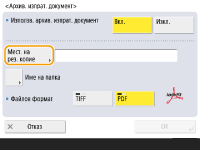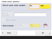 Копие от документ се запаметява, дори и ако се появи грешка при изпращането. В зависимост от типа на дестинацията, може да са в сила следните ограничения. Имейл: Изпратен е имейл без съобщение. Факс/I-факс: Изпратеният факс не може да се запамети като електронен файл. |