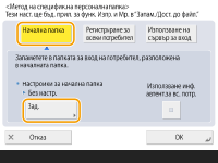 Ако <Метод на спецификация на персон. папка> е зададено на <Регистриране за всеки потребител>, регистрирайте една от следните като персонална папка за всеки потребител. Регистрираните настройки са същите и същата персонална папка е регистрирана, без значение къде е конфигурирана настройката.