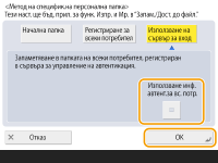 Информацията за удостоверяване, необходима за достъп до лична папка (потребителско име и парола), не може да бъде извлечена от Active Directory. Ако е избрано <Използване инф. автент.за вс. потр.>, потребителското име и паролата за влизане в машината с удостоверяване от клавиатурата се регистрират като информацията за удостоверяване за достъп до лична папка.