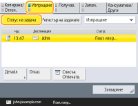 Натискането на <Детайли> <Повторно изпращане> ви позволява да изпратите/запаметите повторно документите, които не са могли да бъдат изпратени/запаметени. За задаване на друга дестинация натиснете <Промяна на дестинация>. За документи с множество дестинации, посочени с използване на един и същ метод на изпращане/запаметяване, натиснете <Списък Разпращане>, изберете дестинация и след това натиснете <Повторно изпращане> или <Промяна на дестинация>.Можете да изпратите/запаметите повторно документи, ако <Изтриване неизпълнени задачи за изпращ.> е зададено на <Изкл.>. <Изтриване неизпълнени задачи за изпращ.> Можете да променяте дестинациите на документи, които са зададени да бъдат изпращани/запаметявани в посочен час, както и на документи, които не са успели да бъдат изпратени/запаметени. Имайте предвид, че не можете да променяте дестинациите за документи със зададени множество дестинации, които се изпращат/запаметяват или когато въвеждането на нова дестинация е ограничено (Ограничаване на нови дестинации). |