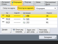 Задаване/регистриране на дестинации от историята на изпращанетоМожете да задавате дестинации и да регистрирате дестинации в адресната книга от историята на изпращането в екрана <Сист. контрол>. Това ви спестява усилието от директно въвеждане на адреса и също така помага за избягване на изпращане до неправилна дестинация поради въвеждане на грешен адрес. Когато задавате дестинация: <Сист. контрол> <Изпращане> <Рег. на зад.> изберете дестинацията за изпращане <Задав. като дест. изпр.> <OK>Когато регистрирате дестинация: <Сист. контрол> <Изпращане> <Рег. на зад.> изберете дестинацията за регистриране <Регистрир. на дестинац.> регистрирайте дестинацията от екрана за регистриране за всеки тип дестинация |