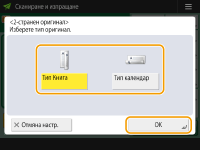 Изберете <Тип Книга> за оригинали, чиито изображения отпред и отзад са ориентирани в една и съща посока, или <Тип календар> за оригинали, чиито изображения отпред и отзад са ориентирани в различни посоки.