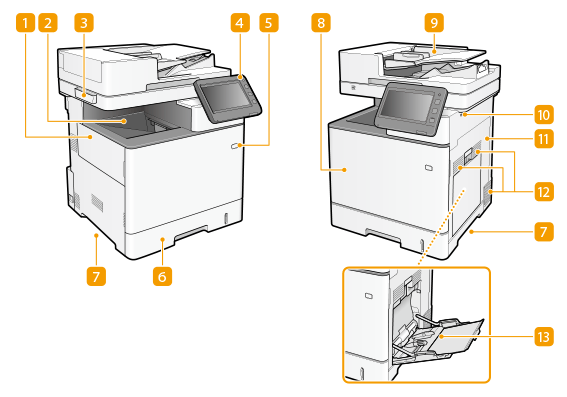 До USB-портів, розташованих на правій стороні апарата, можна підключати пристрій пам’яті USB та друкувати дані безпосередньо з нього. Відскановані за допомогою апарата оригінали також можна зберігати безпосередньо на пристрої пам’яті USB.