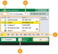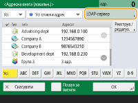 Розкривний список адресДає змогу відобразити конкретну групу адресатів. Якщо ввійти на апарат за допомогою керування персональною автентифікацією, то вибравши <Особист. сп. адрес>, можна відобразити свою особисту адресну книгу.