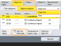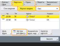 Якщо документи надіслано електронною поштою, список містить інформацію про результат надсилання даних між апаратом і сервером електронної пошти, а не між апаратом і адресатом. Якщо вибрати параметр <Вив. зазн. к-ті док. для перед.> на кроці 3, можна вказати кількість записів журналу, що відображатимуться в списку. Можна вказати, чи потрібно друкувати список автоматично. |