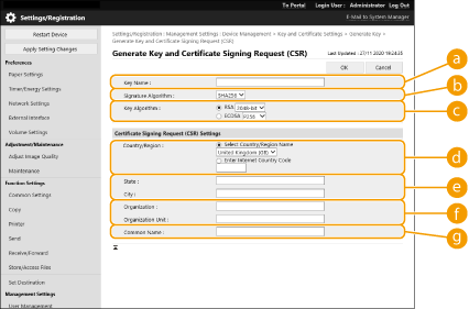 Сертифікати, створені на апараті, не мають цифрового підпису центру сертифікації, що може спричинити помилки під час обміну даними з деякими одноранговими вузлами зв’язку. Щоб запросити сертифікат із цифровим підписом центру сертифікації, необхідно створити запит на підписання сертифіката (CSR). Створити запит CSR може користувач, який увійшов у систему апарата з правами адміністратора.