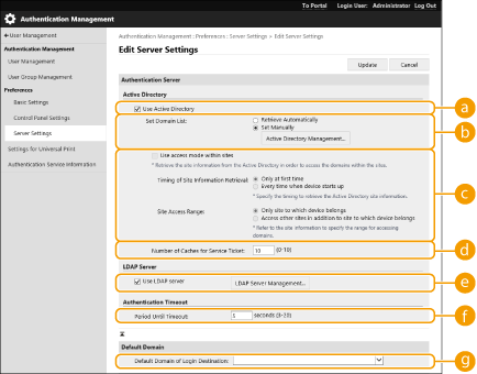 Укажіть, чи отримується інформація Active Directory для місця призначення входу автоматично, або цю інформацію необхідно вводити вручну. Щоб ввести інформацію вручну, виберіть параметр [Set Manually] і вкажіть домен місця призначення для входу в полі [Active Directory Management...].