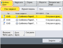 Коли вибрано документ і натиснуто кнопку <Перерив./Пріор. друк>, відобразяться кнопки <Перервати й друкувати> та <Пріоритетний друк>. Натисніть кнопку <Перервати й друкувати>, щоб тимчасово зупинити завдання друку, що виконується, і одразу почніть друк вибраного документа. Щоб підняти вибраний документ в черзі документів, що очікують на друк, і роздрукувати його після завершення завдання друку що виконується, натисніть кнопку <Пріоритетний друк>.