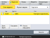 Натисніть <Докладні відомості> <Надіслати повторно>, щоб повторно надіслати/зберегти документи, які не вдалося надіслати/зберегти. Щоб указати іншого адресата, натисніть кнопку <Змінити адресата>. Якщо є документи з кількома адресатами, для зазначення яких використовувався один і той самий спосіб надсилання або збереження, натисніть кнопку <Список розсилок>, щоб вибрати адресата, а потім натисніть кнопку <Надіслати повторно> або <Змінити адресата>.Якщо для параметра <Видалити завдання надсилання з помилкою> встановлено значення <Вимк.>, документи можна надіслати або зберегти повторно. <Видалити завдання надсилання з помилкою> Для документів, надсилання або збереження яких заплановано на певний час, а також для документів, надіслати або зберегти які не вдалося, можна змінити адресатів. Зверніть увагу, що неможливо змінити адресатів для документів із кількома адресатами під час надсилання/зберігання таких документів, а також якщо можливість зазначати нового адресата обмежена (Обмеження нових адресатів). |