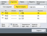 Зазначення/реєстрація адресатів з історії надсиланняВи можете зазначати та реєструвати адресатів в адресній книзі з історії надсилання на екрані <Монітор стану>. Це заощаджує час, оскільки не вимагає безпосереднього введення адреси, а також запобігає надсиланню даних неправильному адресату через введення неправильної адреси. Зазначення адресата: <Монітор стану> <Надіслати> <Журнал завдань> виберіть адресата для надсилання <Зазначити як адрес. надс.> <OK>Реєстрація адресата: <Монітор стану> <Надіслати> <Журнал завдань> виберіть адресата для реєстрації <Зареєстр. адресата> зареєструйте адресата на екрані реєстрації для кожного типу адресата |