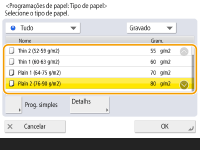 Se o tipo de papel colocado não for apresentado, carregue em <Prog. detalh.> para o selecionar a partir de uma lista.