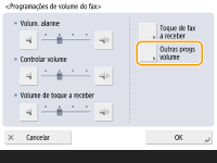 <Volum. alarme>Ajuste o volume do som produzido quando a transmissão de um fax é cancelada ou após a conclusão da impressão de um fax recebido. Se não pretender que seja produzido um som, carregue em