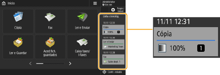 Para obter informações sobre os ícones e os itens apresentados na linha cronológica, consulte Itens apresentados na linha cronológica Pode ser apresentada uma linha cronológica para cada utilizador. Se não tiver uma sessão iniciada, pode ser visualizada uma linha cronológica partilhada para utilizadores que não usam autenticação, tais como utilizadores não autenticados ou utilizadores convidados. Altere as configurações para <Autoriz. utiliz. n/autent. a usar linha cronológ.> e <Perm. ut. c/ses. inic. usar linha cronol.> de acordo com as suas necessidades. Personalizar o ecrã <Início> A linha cronológica para utilizadores sem sessão iniciada ou utilizadores convidados é guardada quando <Progr. arranque rápido para aliment. principal> está configurado para <Ligado> e é executado o arranque rápido. Quando a alimentação é desligada com <Progr. arranque rápido para aliment. principal> programado para <Desligado>, ou não for possível executar o arranque rápido, a linha cronológica para utilizadores sem sessão iniciada e utilizadores convidados é eliminada. A linha cronológica não pode ser importada/exportada. Importar/exportar dados de programações |
