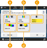 | Pode selecionar o modo de cor para cópia. Esta função permite, por exemplo, poupar toner copiando originais com cor a preto e branco ou copiar bilhetes com uma só cor (por exemplo, vermelho ou azul) para indicar a data em que são distribuídos. |