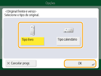 1 | Carregue em <Apg. moldura do livro> e verifique <Formato orig.>. ![]() Se o formato apresentado em <Formato orig.> for diferente do formato do livro, carregue em <Alterar> para selecionar o formato. Só pode programar o modo Apagar moldura do livro para os formatos de originais que aparecem no visor do painel digital. |