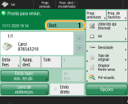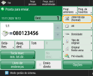 Gravar uma cópia de um documento enviadoÉ possível programar a máquina para que uma cópia de um documento enviado seja automaticamente gravada num servidor de ficheiros. A cópia é convertida num ficheiro eletrónico, como um PDF, e gravada, permitindo verificar facilmente o conteúdo no computador. Gravar uma cópia de um documento enviado Selecionar o nome de um remetenteNo ecrã das funções básicas de fax, carregar em <Opções> <Nome do remetente (TTI)> permite selecionar um nome numa lista de nomes de remetentes registados, para inclusão nas informações do remetente. <Gravar nome do remetente (TTI)>Se iniciar sessão utilizando autenticação de utilizadores, o nome de início de sessão aparece no campo <100> de Nome do remetente (TTI). Verificar imagens lidas antes de enviarÉ possível verificar imagens lidas no ecrã de pré-visualização antes de proceder ao envio. Verificar imagens lidas antes de enviar (Pré-visualização) Gravar programações utilizadas frequentementeÉ possível combinar destinos frequentemente utilizados e programações de leitura num botão da máquina para utilização posterior. Ao carregar no botão gravado durante a leitura de originais, pode concluir rapidamente as suas programações. Gravar uma combinação de funções utilizadas frequentemente |
