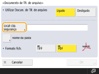 Não é possível efetuar o envio direto se programar <Documento de TR. de arquivo> para <On>. Esta programação muda automaticamente para <Off> nos seguintes casos. Especifique o destino novamente ou reponha a definição para <On>, conforme necessário. Se o destino da cópia de segurança tiver sido eliminado do livro de endereços Se tiver sido importado um livro de endereços da UI remota Importar/exportar dados de programações Quando tiver sido recebido um livro de endereços do Software de gestão de livros de endereços. <Imp./exp. do softw. de gestão do livro de ender.> |